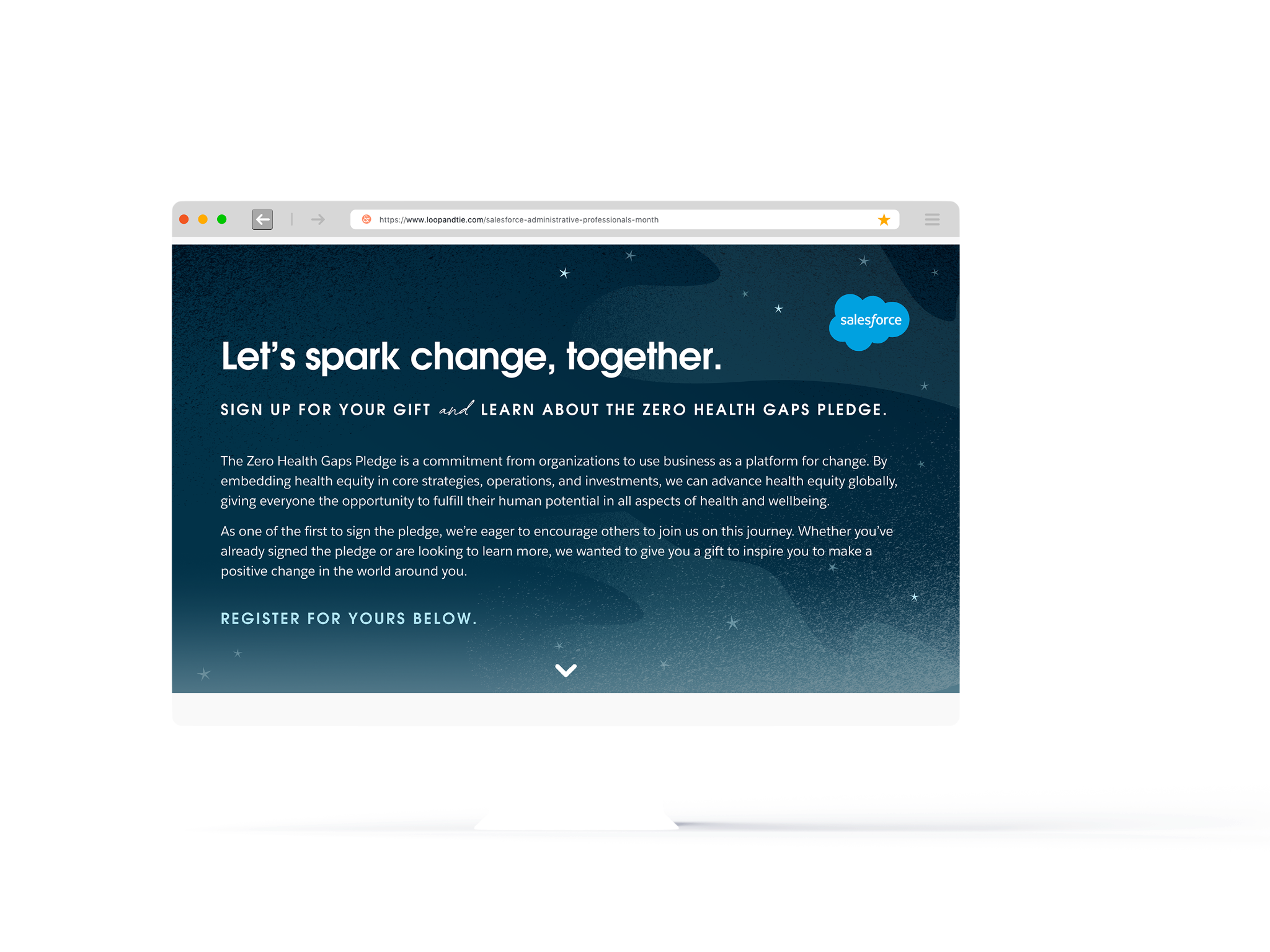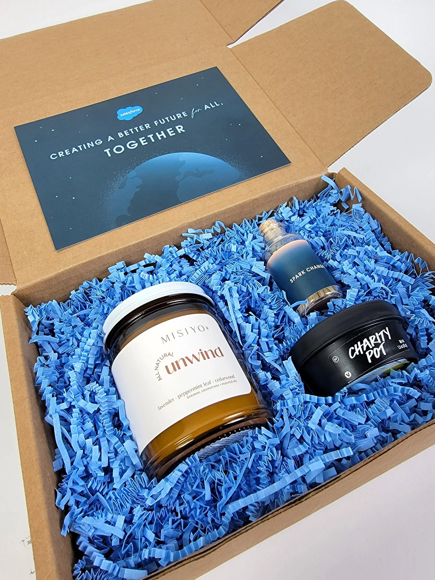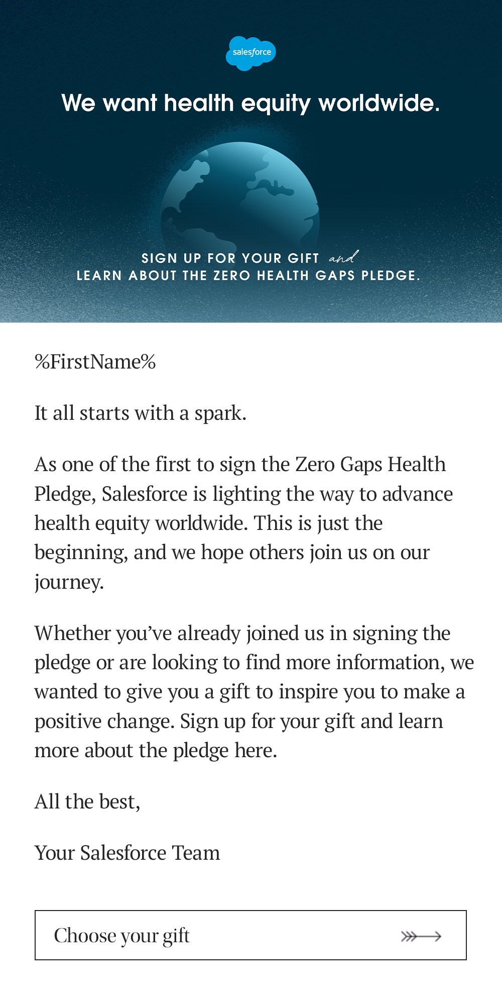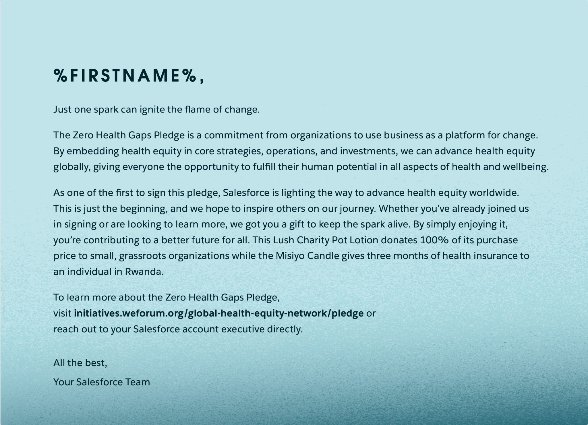The World Economic Forum created the Zero Health Gaps Pledge as a “commitment from CEOs across industries and regions for their organizations to play their part by embedding health equity in core strategies, operations, and investments.” Salesforce was one of the first to sign. For this project, our Salesforce partners wanted to demonstrate their commitment to health equity, establish themselves as a leader in the health equity space, and rally ABM targets toward the initiative. We created this kit to do just that. Each recipient received the Lush Charity Pot Lotion, donating to small, grassroots organizations, a Misiyo Candle, giving someone in Rwanda three months of health insurance, and a set of custom matches to complete the gift. I led creative strategy, concepts, and copy creation, while Ben Warner led design execution.
